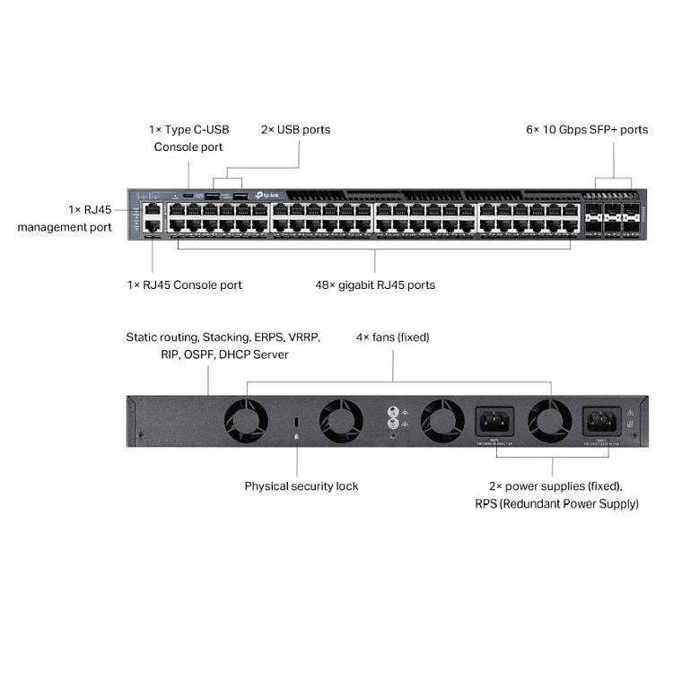 TP-LINK (SG6654X) Omada 48-Port Gigabit Stackable L3 Managed Switch with 6x 10G SFP+ Slots, USB