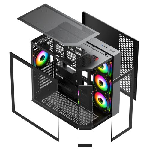 Vida Edge Black ARGB Gaming Cube Case w/ Glass Side, Front & Corner, ATX, 4x ARGB PWM Fans, 6-Port Fan Hub & Remote Control, Asus BTF Compatible