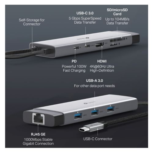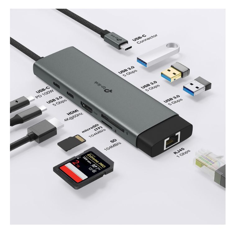 TP-LINK (UH9120C) 9-in-1 USB-C Hub - 1x USB-C (PD 100W), 1x USB-C 5Gbps, 3x USB-A 5Gbps, 1x HDMI, 1x LAN, SD/microSD, Mains Powered