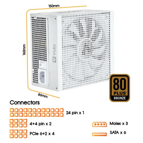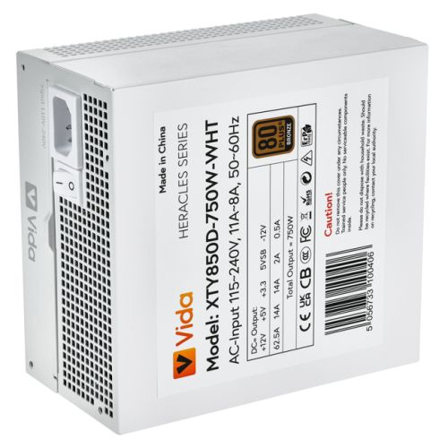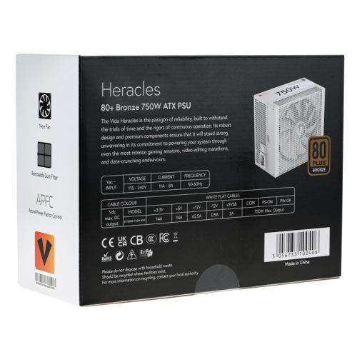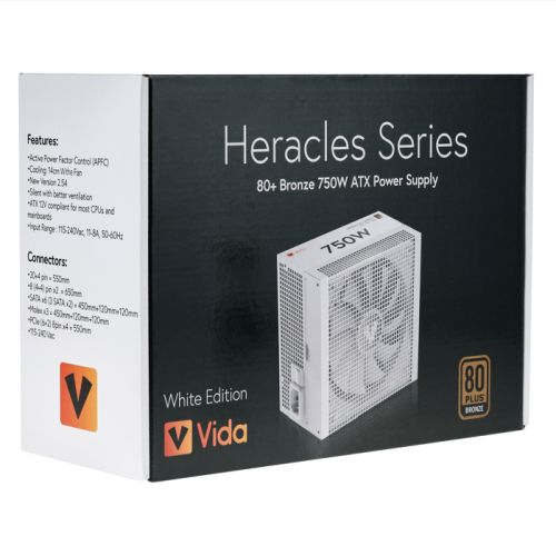 Vida 750W Heracles White ATX Gaming PSU, 80+ Bronze, 140mm Ultra-Quiet FDM Fan, Flat White Cables, Power Lead Not Included