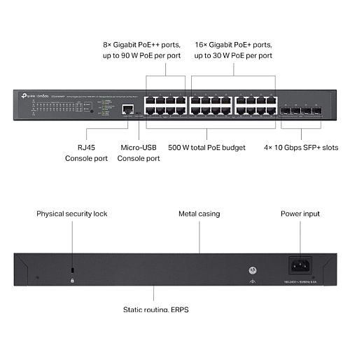 TP-LINK (SG3428XMPP) Omada 24-Port Gigabit and 4-Port 10GE SFP+ L2+ Managed Switch with 16-Port PoE+ & 8-Port PoE++ Rackmountable