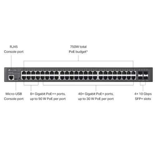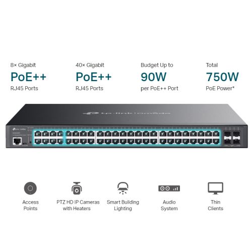TP-LINK (SG3452XMPP) Omada 48-Port Gigabit and 4-Port 10GE SFP+ L2+ Managed Switch with 40-Port PoE+ & 8-Port PoE++, Rackmountable